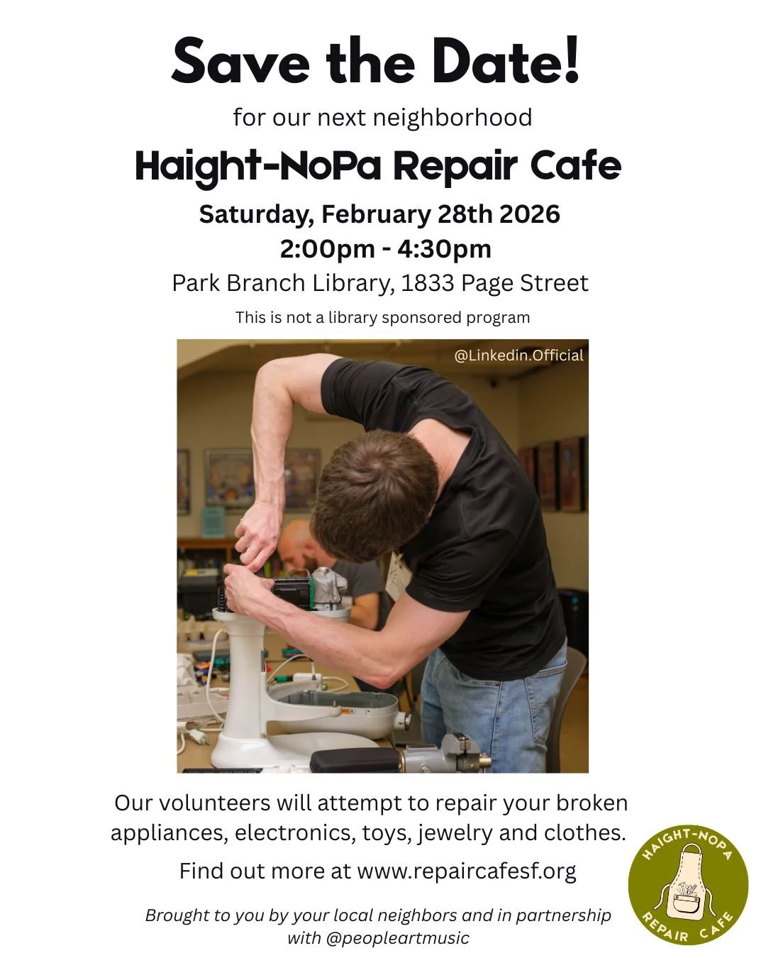 Back to All Events Haight - NoPA Repair Cafe Saturday, February 28, 2026 2:00 PM 4:30 PM Park Branch Library 1833 Page Street San Francisco, CA, 94117 United States (map) Google Calendar ICS